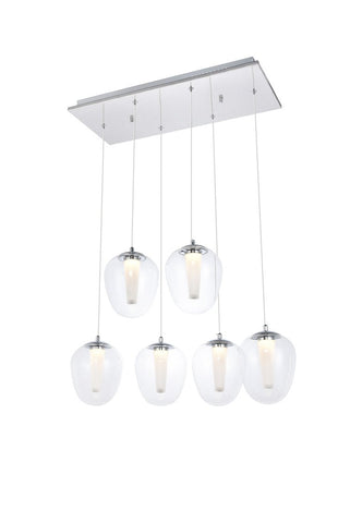 Clear glass shade with chrome finish top encases white textured center point with light inside; 6 hanging together.