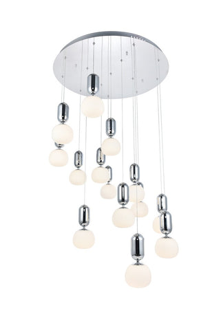 The Lea 14-light pendant in a chrome finish is a bulbous affair. In modern whimsy, chrome capsules accent the white spherical shades, dimming the lights softly as they shine through in unaffected brilliance. With contemporary style and a luxurious charm, this pendant will amaze and fascinate all.